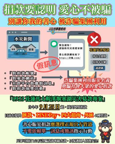 愛心捐款請牢記「三查二不」查團體:確認募款單位是否為合法機構(查官網、查公告)查許可:是否有公益勸募許可字號,且用途明確查收款戶名:銀行轉帳時確認戶名應為法人/機構名稱,非個人戶不點不明連結:不要在連結或表單中輸入個資、卡號、OTP 驗證碼不匯個人帳戶:如「王OO」、「林OO」等自然人戶名皆為警訊真心助人很暖心,守護善意更安心